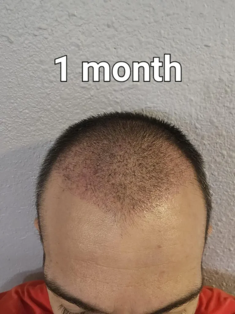 At one month post-hair transplant, the scalp may show mild redness, uneven density, and short, visible hairs. This is normal and does not indicate final coverage.