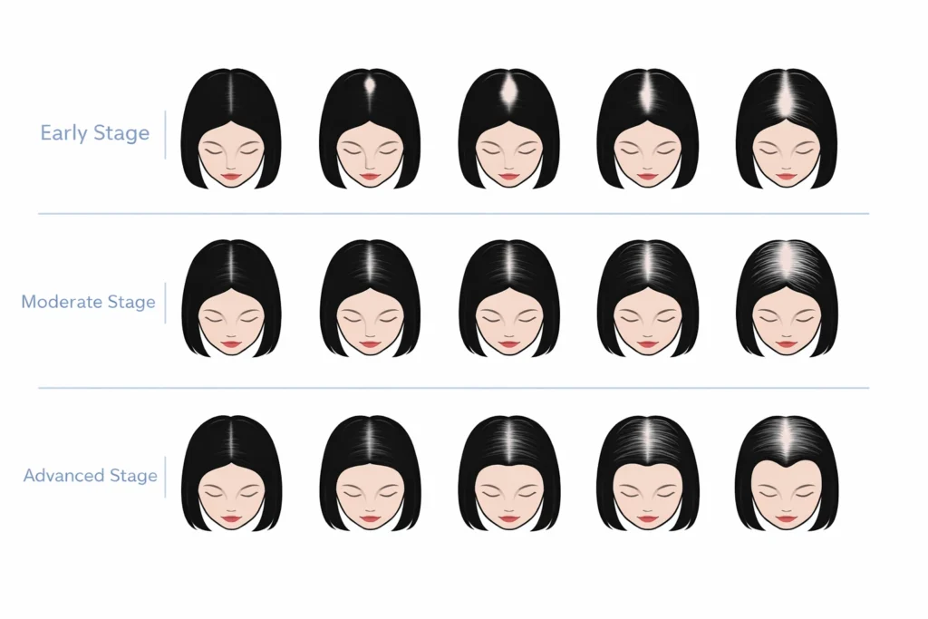 If symptoms progress slowly, the cause is more likely female pattern hair loss rather than a temporary issue. Early treatment can help slow this process and support regrowth while follicles are still active.