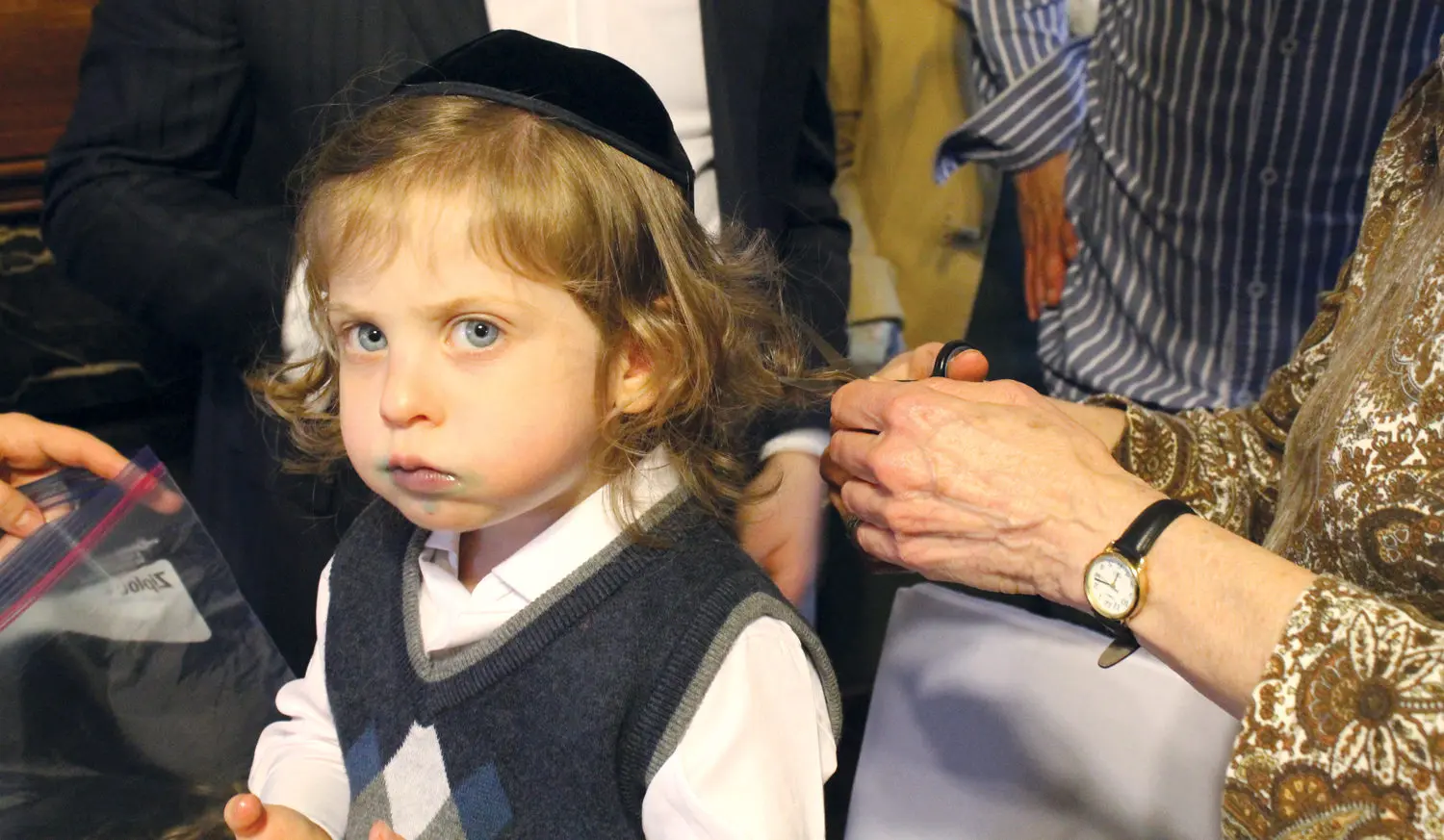 The Upsherin haircut takes place at or after the third birthday. Family members cut small pieces of hair. The payot remain untouched.
