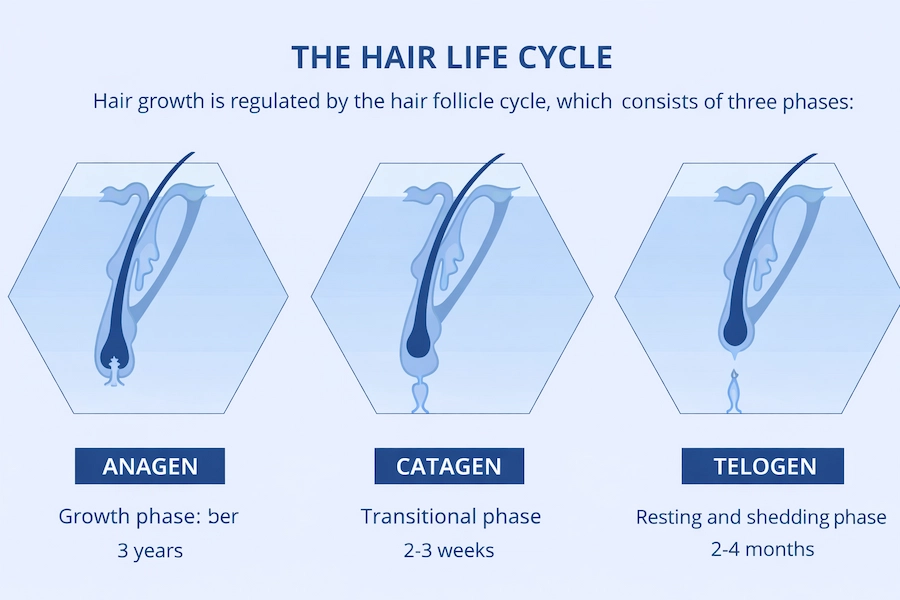 In simple terms, more hairs enter the resting phase simultaneously, leading to visible shedding. This process is commonly associated with telogen effluvium.